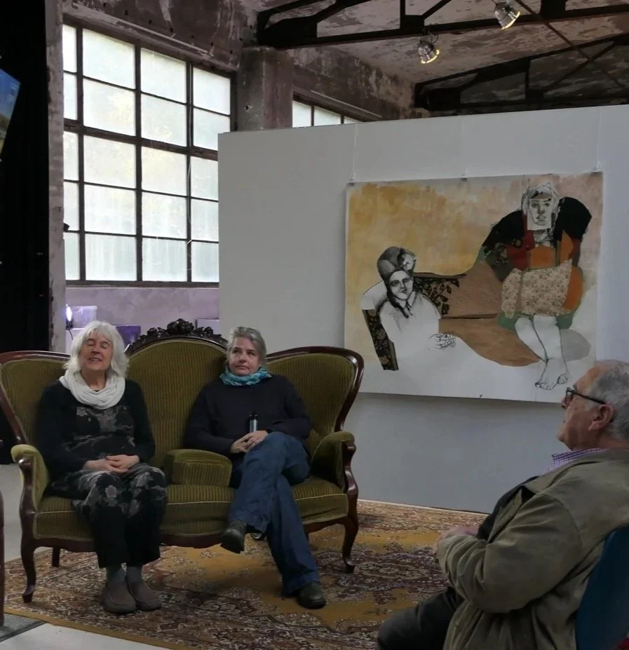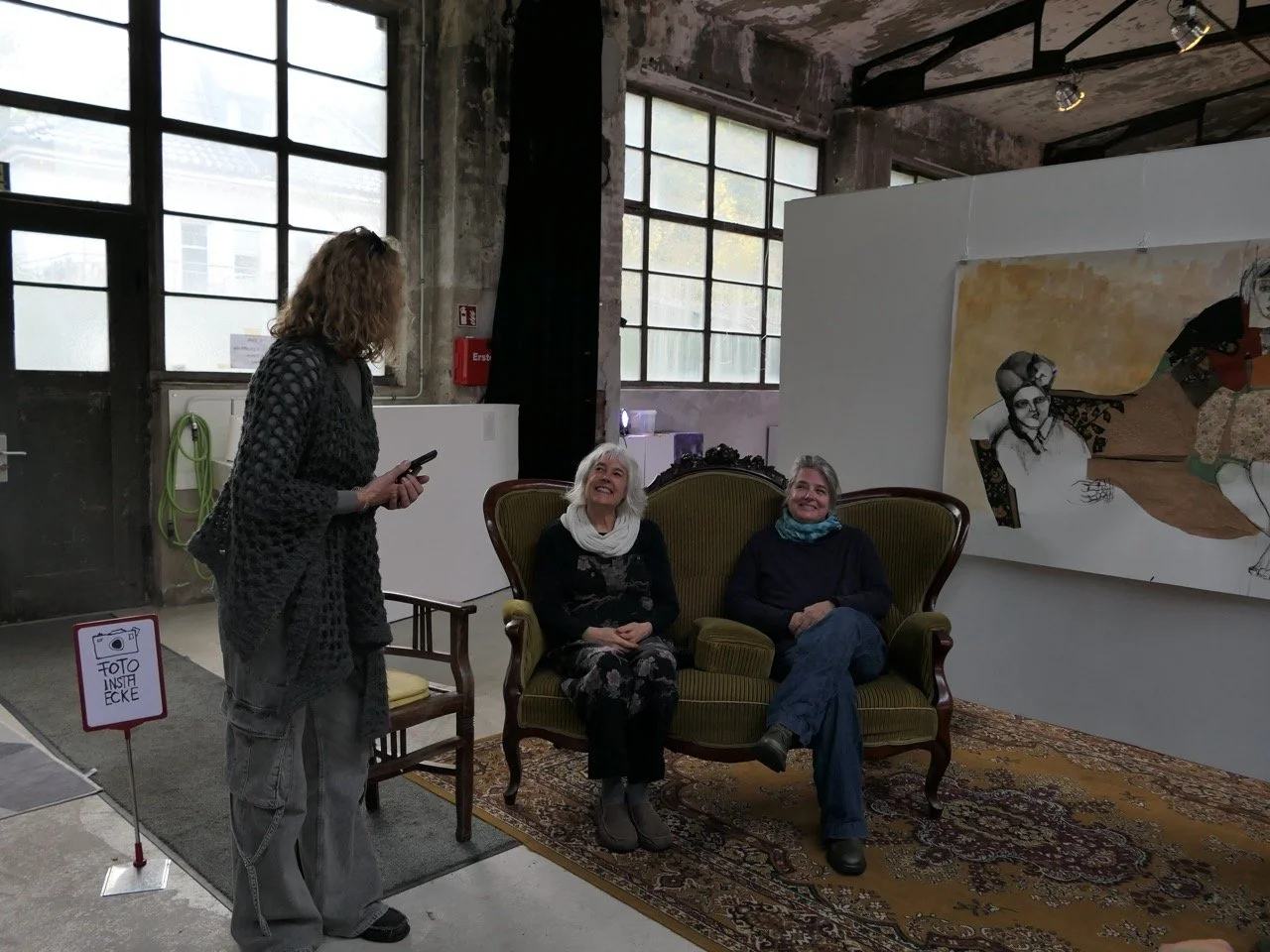 Einige ihrer Werke wurden in enger Zusammenarbeit entwickelt. Gefragt, wie sie dieses gemeinsame kreative Schaffen erlebt haben, waren sich beide einig, dass Sie trotz ihrer eigenen Identitäten versucht haben, durch dieses Zusammenwirken zu einer Art dritter “hybrider” Person zu fusionieren, um dann etwas Neues zu schaffen. Dieser Prozess war jedoch nicht so ganz ohne Hindernisse, aber ihre langjährige Freundschaft und ihre künstlerische Erfahrung haben bei diesem Prozess durchaus geholfen. Nichtdestotrotz mussten auch sie sich doch erstmal einmal zusammenraufen. Bei dem ersten gemeinsamen Bild erkennt man noch klar eine kreative “Demarkationslinie” zwischen den Beiträgen beider Künstlerinnen: Zwei fremdelnde Figuren an den gegenüberliegenden Ecken des Sofas sitzend.