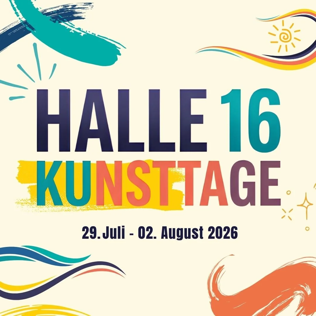Halle 16 Kunsttage Mittwoch, 29. Juli 2026 15:00 Sonntag, 2. August 2026 18:00 HALLE 16: Projektraum für Kunst 16 Zeppelinstraße 72172 Sulz am Neckar Deutschland (Karte) Google Kalender ICS Unter dem Thema "Körperbild" soll es 5 Tage lang ein buntes Mitmach-Angebot aus verschiedenen Sparten geben. Freut euch auf Angebote aus Tanz, Musik, bildende Kunst, Theater und Artistik.Weitere Details folgen