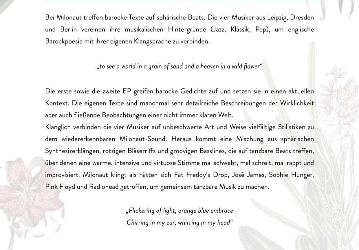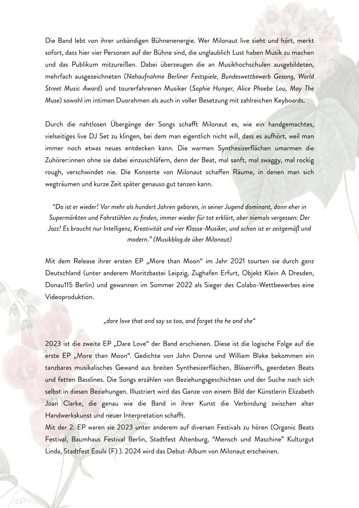 Milonaut hat handgemachte Popmusik aus breiten Synthesizerflächen, rotzigen Bläserriffs und groovigen Basslines im Gepäck. Die vier Musiker aus Leipzig, Dresden und Berlin, vereinen barocke Poesie und eigene Texte mit modernen Klanglandschaften und schafft eine einzigartige Soundwelt. Mit ihrer Mischung aus sphärischen Synthesizern, kraftvollen Bläserriffs und bouncige Beats, begleitet von einer warmen und intensiven Stimme, schafft Milonaut ein Konzert-Erlebnis, das zum Tanzen und Träumen einlädt. Ihre musikalische Virtuosität überzeugt, ihre Bühnenenergie ist unbändig.